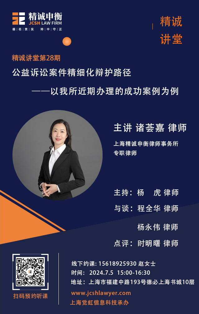 2024年7月5日,上海精诚申衡律师事务所第二十八期“精诚讲堂”圆满开展。本次讲堂由我所诸荟嘉律师主讲,聚焦于“公益诉讼案件精细化辩护路径——以我所近期办理的‘食品安全公益诉讼案’为例”,杨虎律师主持,程全华和杨永伟两位律师与谈,高级合伙人时明曙律师进行总点评。