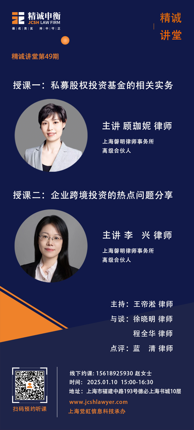 2025年1月10日,上海精诚申衡律师事务所第四十九期精诚讲堂,邀请了上海磐明律师事务所顾珈妮主任和李兴律师主讲,分别围绕“私募股权投资基金的相关实务”和“企业跨境投资的热点问题”分享。本次精诚讲堂由我所高级合伙人王帝淞律师主持,高级合伙人徐晓明和程全华律师与谈,蓝清主任进行总点评。