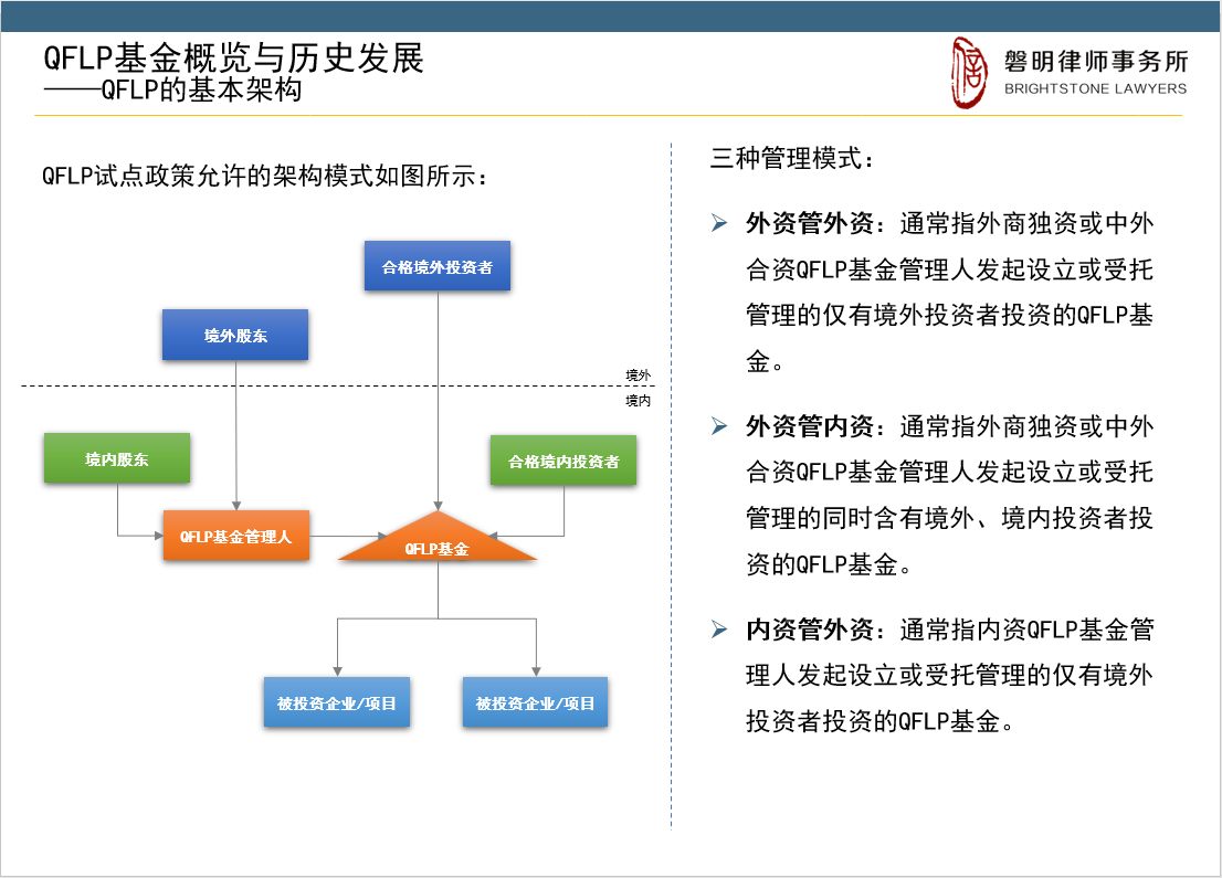 私募基金,是指以非公开方式向特定投资者募集资金并以特定目标为投资对象的证券投资基金。具有灵活性高、收益潜力大等特点,吸引了大量投资者的关注。其中,QFLP 试点政策允许的架构模式涉及多个主体,包括境外股东、境内股东、合格境外投资者、合格境内投资者以及 QFLP 基金管理人等。这些主体之间通过特定的股权关系和资金流向,构成了一个完整的基金架构。