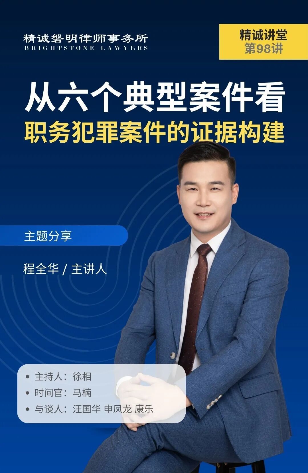 2026年3月19日,上海精诚磐明律师事务所「精诚讲堂」第98期,程全华律师作《从六个典型案件看职务犯罪案件的证据构建》专题分享,徐相主持,马楠担任时间官,汪国华律师、申凤龙律师、康乐律师为与谈人。