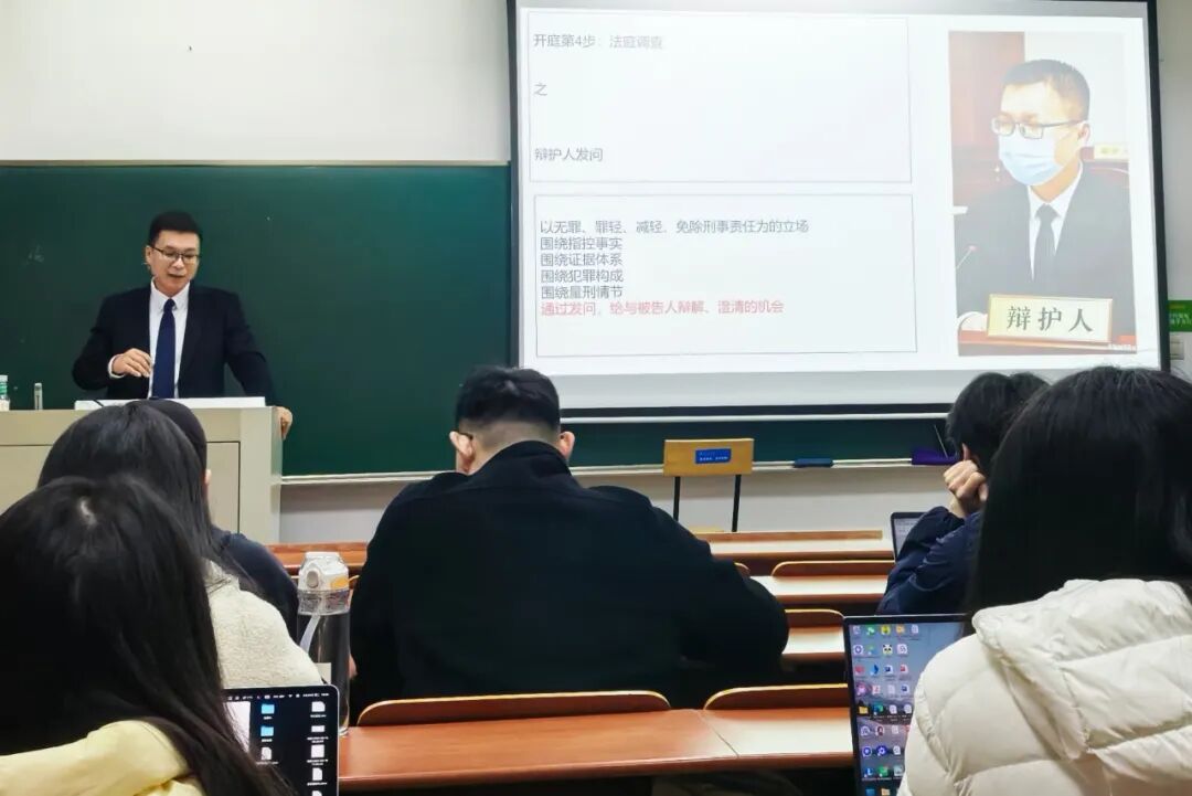 杨永伟律师以公诉案件一审普通程序为视角,以刑事诉讼法和司法解释为切入点,详细介绍了一审公诉案件普通程序庭审的基本流程,并详细阐述了庭审中的细节和注意事项。杨永伟律师结合同学们即将开展的模拟法庭,把刑事诉讼一审普通程序拆解为为:书记员的准备工作、审判长的准备工作、公诉人的工作、法庭发问、举证质证、法庭辩论、最后陈述、评议宣判等八个环节。