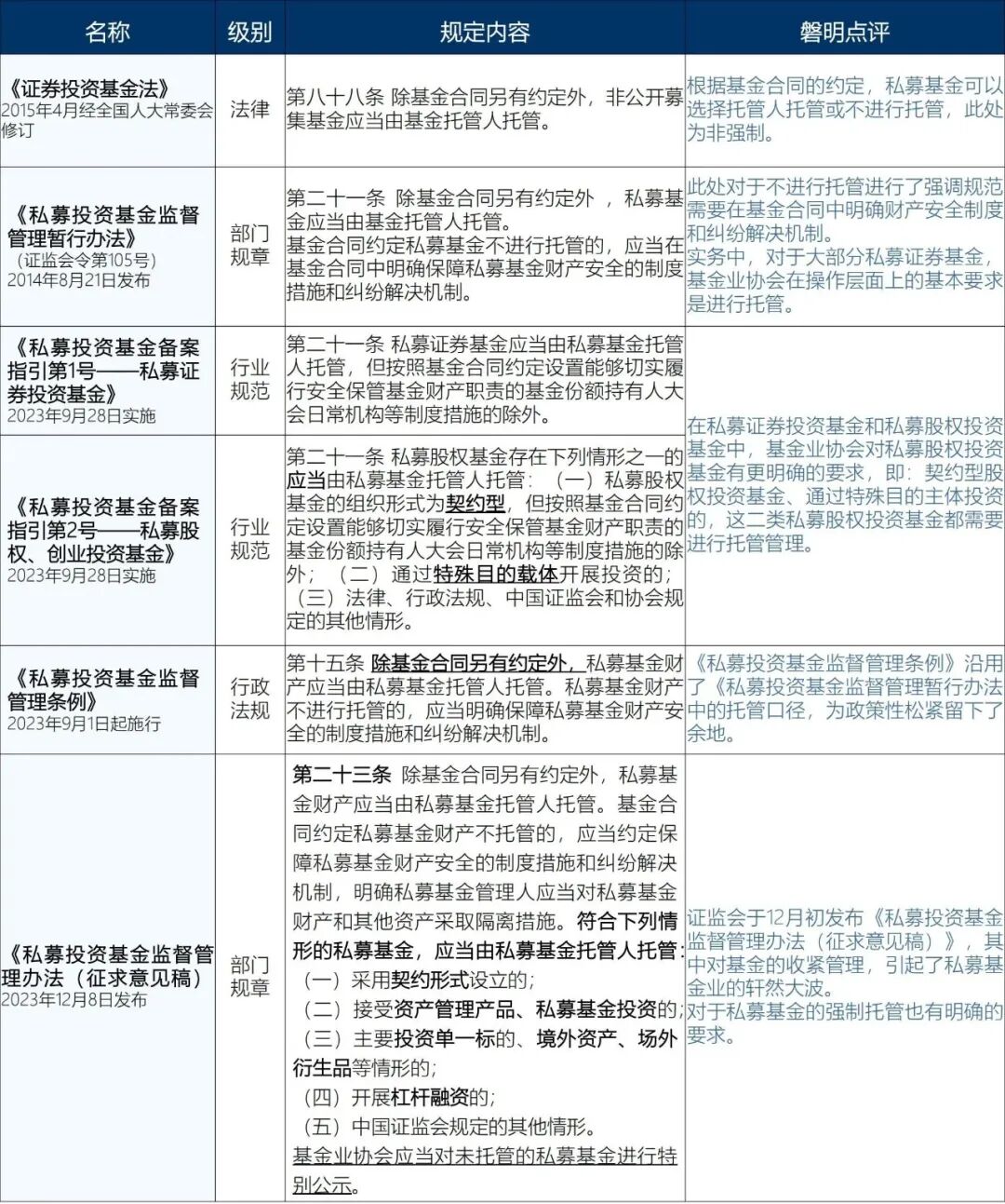 根据法律、部门规章和行业规范的级别分类,一起看看对于基金资产托管的现行规定及趋势: