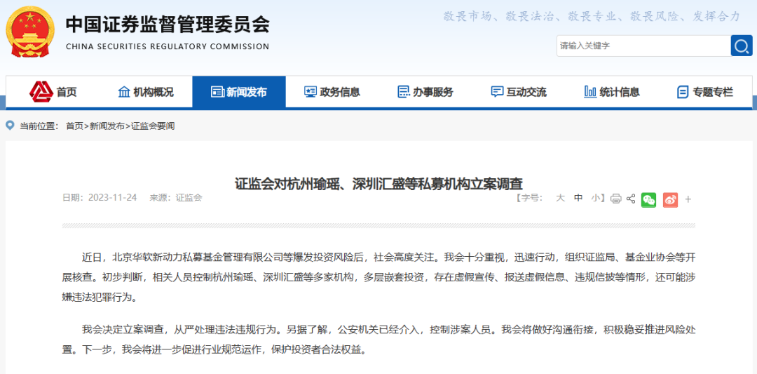 磐明所于2023年11月22日发表了《磐明观察-解读“杭州30亿私募造假跑路”事件》,之后于11月24日,证监会发布公告明确将对“杭州瑜瑶”、“深圳汇盛”等多家机构可能涉嫌违法犯罪的情况进行调查。